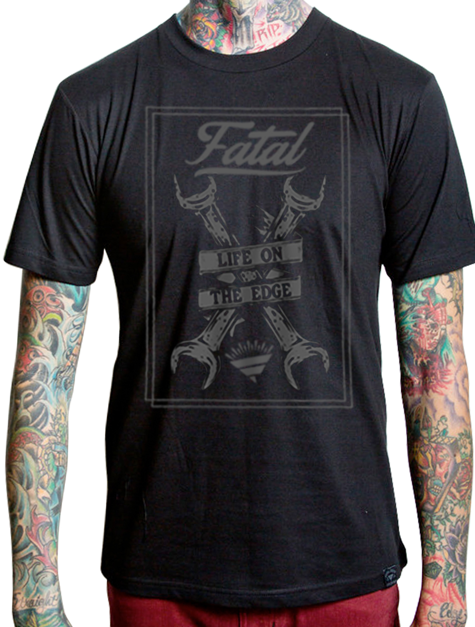 Classic Fatal design on a Premium Motorsports Fatal tee… ? Designed and screen printed in the USA, imported fabric ? Slim Fit ? 50% Cotton, 50% Poly ? Printed neck label for a no-tag feel