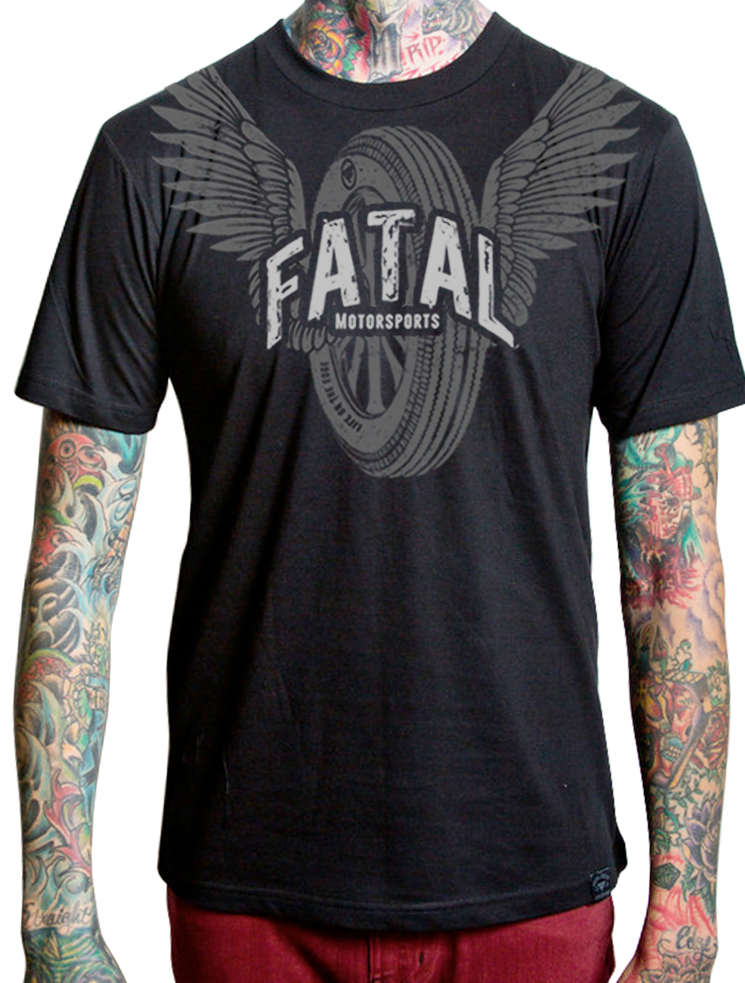 Classic Fatal design on a Premium Motorsports Fatal tee… ? Designed and screen printed in the USA, imported fabric ? Slim Fit ? 50% Cotton, 50% Poly ? Printed neck label for a no-tag feel